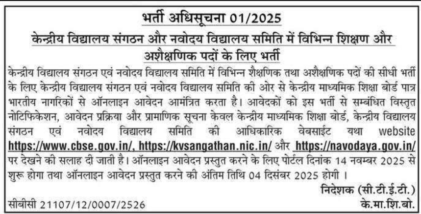Kendriya Vidyalaya Sangathan (KVS) और Navodaya Vidyalaya Sangathan (NVS) द्वारा Teaching एवं Non-Teaching Recruitment 2025 के लिए