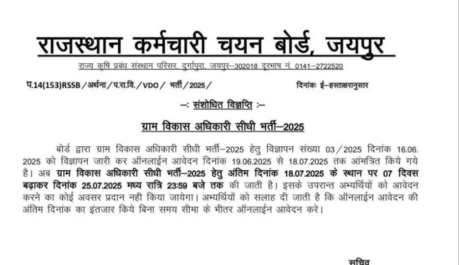 Rajasthan Staff Selection Board (RSSB) рдиреЗ Village Development Officer (VDO) Recruitment 2025 рдХрд╛ рдкрд░рд┐рдгрд╛рдо рдЖрдзрд┐рдХрд╛рд░рд┐рдХ рд╡реЗрдмрд╕рд╛рдЗрдЯ рдкрд░ рдЬрд╛рд░реА рдХрд░ рджрд┐рдпрд╛ рд╣реИред рдЬрд┐рди рдЙрдореНрдореАрджрд╡рд╛рд░реЛрдВ рдиреЗ 02 November 2025 рдХреЛ рдЖрдпреЛрдЬрд┐рдд рд▓рд┐рдЦрд┐рдд рдкрд░реАрдХреНрд╖рд╛ рдореЗрдВ рднрд╛рдЧ рд▓рд┐рдпрд╛ рдерд╛, рд╡реЗ рдЕрдм рдЕрдкрдирд╛ government result рдСрдирд▓рд╛рдЗрди PDF рдХреЗ рдорд╛рдзреНрдпрдо рд╕реЗ рджреЗрдЦ рд╕рдХрддреЗ рд╣реИрдВред рдпрд╣ рднрд░реНрддреА рдЧреНрд░рд╛рдореАрдг рд╡рд┐рдХрд╛рд╕ рд╡рд┐рднрд╛рдЧ рдореЗрдВ рдПрдХ рдорд╣рддреНрд╡рдкреВрд░реНрдг рдЕрд╡рд╕рд░ рд╣реИ рдФрд░ рд╢рд┐рдХреНрд╖рд╛ рдХреНрд╖реЗрддреНрд░ рд╕реЗ рдЬреБрдбрд╝реЗ рдЫрд╛рддреНрд░реЛрдВ рдХреЗ рд▓рд┐рдП рдЙрдкрдпреЛрдЧреА рдЬрд╛рдирдХрд╛рд░реА рдкреНрд░рджрд╛рди рдХрд░рддреА рд╣реИред